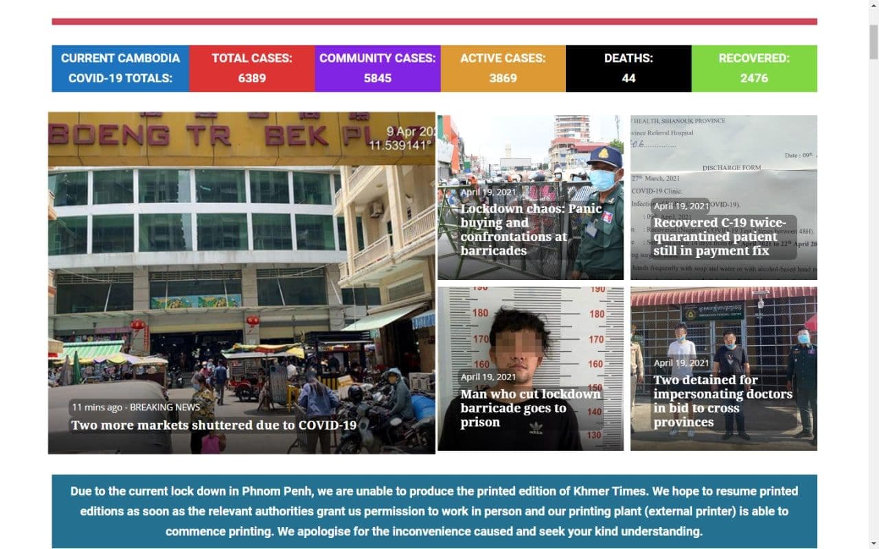 - خمر تایمز:- تعداد کل مبتلایان به کووید در کامبوج با ثبت رکورد ۶۱۸ مورد جدید به شش هزار و ۳۸۹ نفر افزایش یافت و با مرگ چهار بیمار، مجموع جان باختگان این کشور به ۴۳ نفر رسیده است.