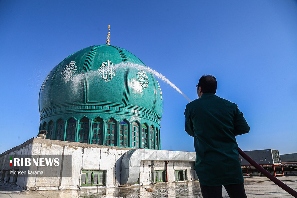 شست و شوی گنبد و تعویض پرچم مسجد مقدس جمکران