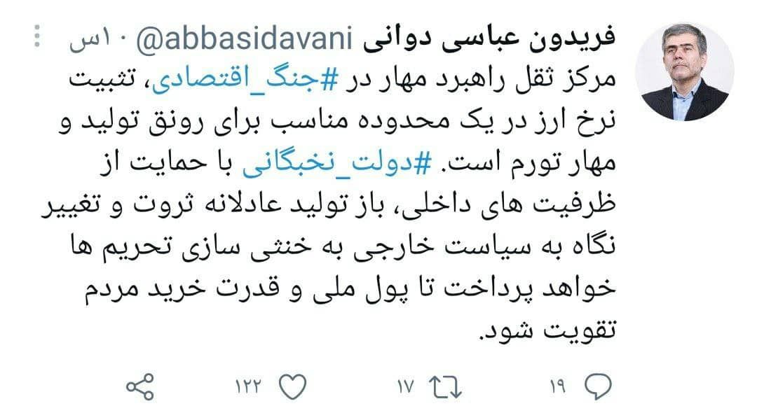 به گزارش گروه مجازی خبرگزاری صدا و سیما، فریدون عباسی دوانی نماینده مردم کازرون و کوهچنار در مجلس یازدهم در صفحه شخصی خود در توئیتر نوشت: مرکز ثقل راهبرد مهار در جنگ اقتصادی، تثبیت نرخ ارز در یک محدوده مناسب برای رونق تولید و مهار تورم است. دولت نخبگانی با حمایت از ظرفیت های داخلی، باز تولید عادلانه ثروت و تغییر نگاه به سیاست خارجی به خنثیسازی تحریمها خواهد پرداخت تا پول ملی و قدرت خرید مردم تقویت شود.