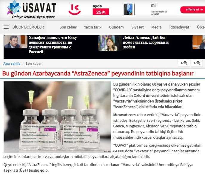 - تزریق واکسن آسترازنکا به منظور ایجاد ایمنی در مقابل کرونا، از امروز در جمهوری آذربایجان آغاز میشود.