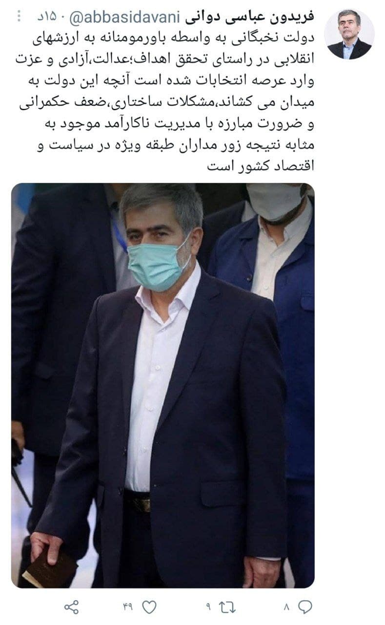 به گزارش گروه مجازی خبرگزاری صدا و سیما، فریدون عباسی دوانی نماینده مردم کازرون و کوهچنار در مجلس یازدهم در صفحه شخصی خود در توئیتر نوشت: دولت نخبگانی به واسطه باورمومنانه به ارزشهای انقلابی در راستای تحقق اهداف؛ عدالت، آزادی و عزت وارد عرصه انتخابات شده است آنچه این دولت به میدان میکشاند، مشکلات ساختاری، ضعف حکمرانی و ضرورت مبارزه با مدیریت ناکارآمد موجود به مثابه نتیجه زور مداران طبقه ویژه در سیاست و اقتصاد کشور است.