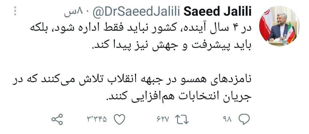 به گزارش گروه مجازی خبرگزاری صدا و سیما، سعید جلیلی عضو مجمع تشخیص مصلحت نظام در صفحه شخصی خود در توئیتر نوشت: در ۴ سال آینده، کشور نباید فقط اداره شود، بلکه باید پیشرفت و جهش نیز پیدا کند.