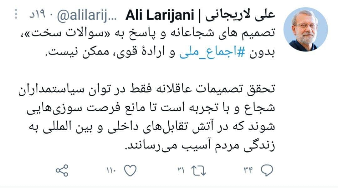 به گزارش گروه مجازی خبرگزاری صدا و سیما، علی لاریجانی رئیس سابق مجلس شورای اسلامی در صفحه شخصی خود در توئیتر نوشت: تصمیم‌های شجاعانه و پاسخ به «سوالات سخت»، بدون اجماع ملی و ارادۀ قوی، ممکن نیست.