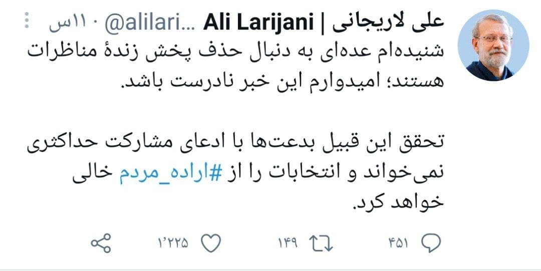 به گزارش گروه مجازی خبرگزاری صدا و سیما، علی لاریجانی رئیس سابق مجلس شورای اسلامی در صفحه شخصی خود در توئیتر نوشت: شنیدهام عدهای به دنبال حذف پخش زندۀ مناظرات هستند؛ امیدوارم این خبر نادرست باشد.