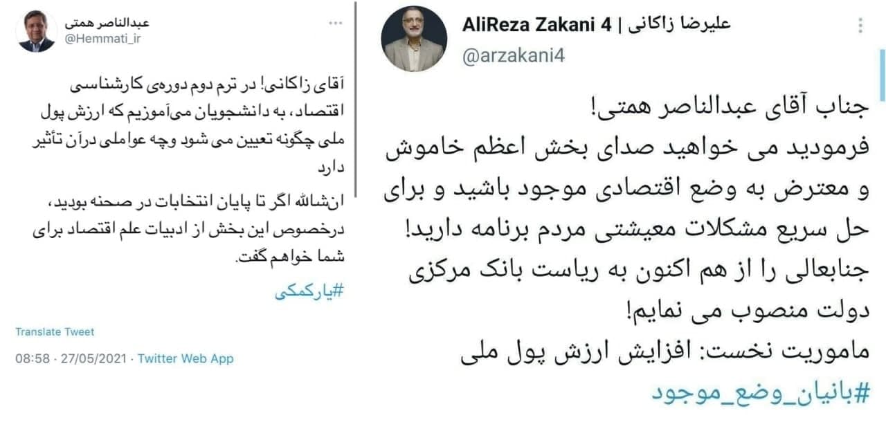 آقای علیرضا زاکانی روز گذشته در فضای مجازی خطاب به آقای همتی نوشته بود: