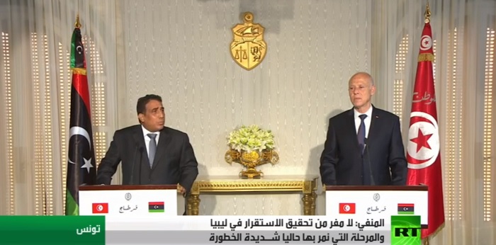 محمد المنفی رئیس شورای ریاست جمهوری لیبی در دیدار با قیس سعید رئیس جمهور تونس گفت راهی جز ایجاد ثبات امنیتی در لیبی وجود ندارد. وی تاکید کرد نمیتوان امنیت و ثبات لیبی و تونس را از یکدیگر جدا دانست.