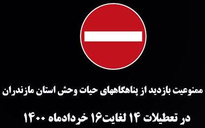 به گزارش خبرگزاری صدا و سیمای مرکز مازندران، حسینعلی ابراهیمی کارنامی گفت: به مناسبت شهادت امام جعفر صادق (ع)، سی و دومین سالگرد رحلت امام خمینی (ره) و با توجه به تاکید ستاد ملی مقابله با ویروس کرونا برای حفظ سلامت مردم، بازدید از پناهگاههای حیات وحش دشت ناز میاندورود، سمسکنده ساری و میانکاله بهشهر از فردا جمعه ۱۴ تا یکشنبه هفته آینده ۱۶ خرداد به مدت سه روز ممنوع است.