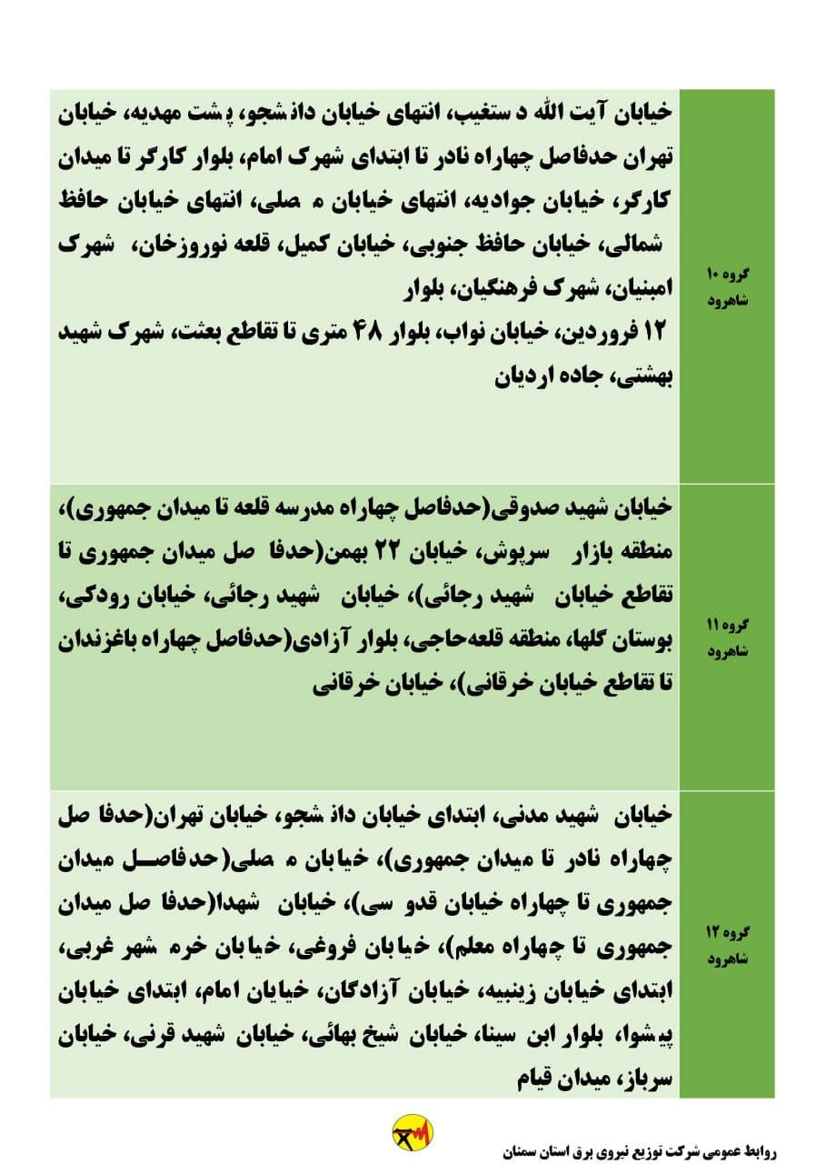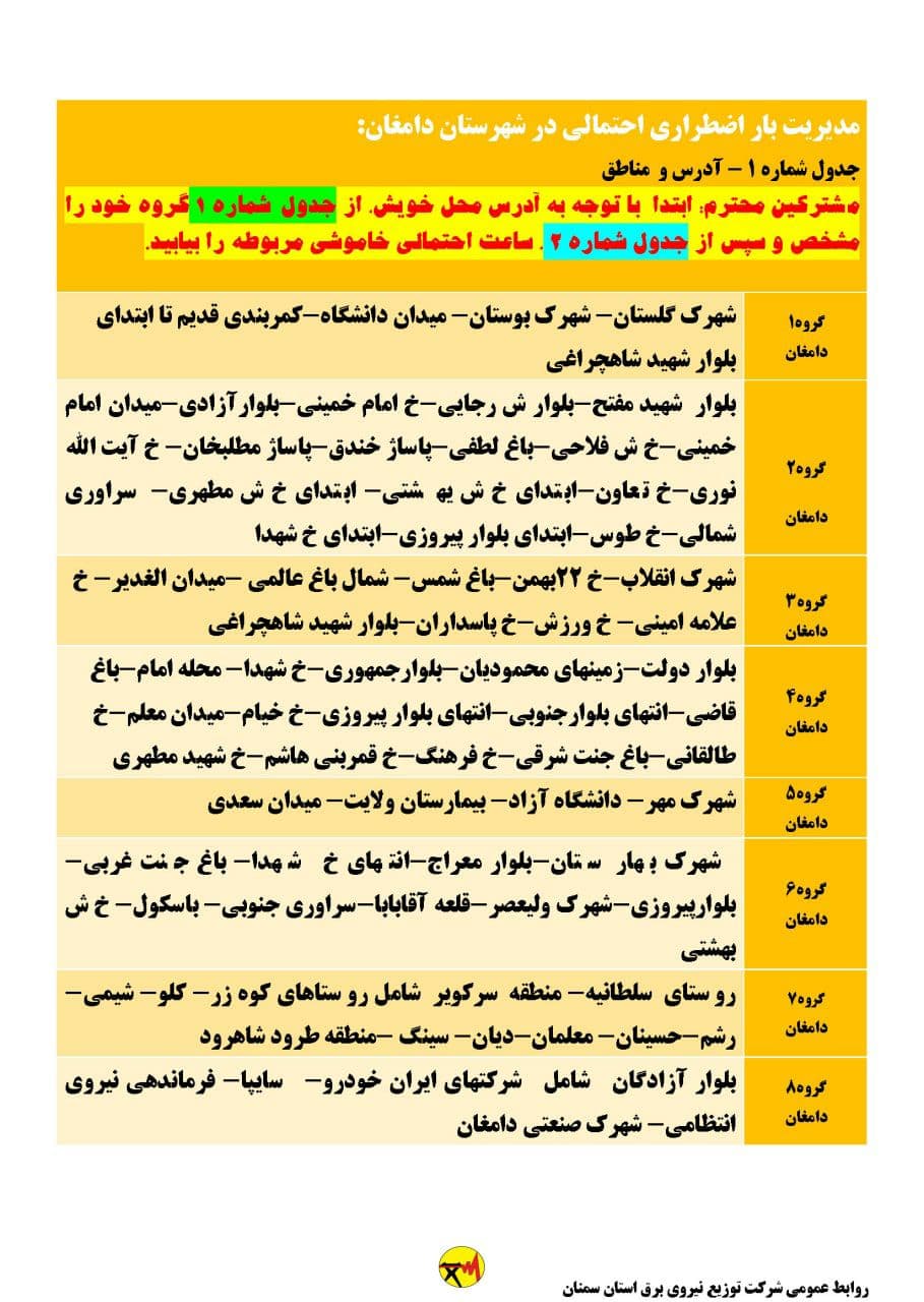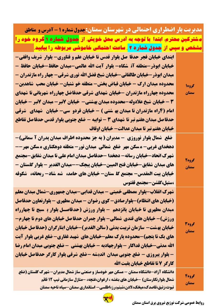 شرکت توزیع برق استان سمنان، برنامه مدیریت بار اضطراری برق و خاموشیهای احتمالی را در روز پنجشنبه دهم تیرماه ماه اعلام کرد.