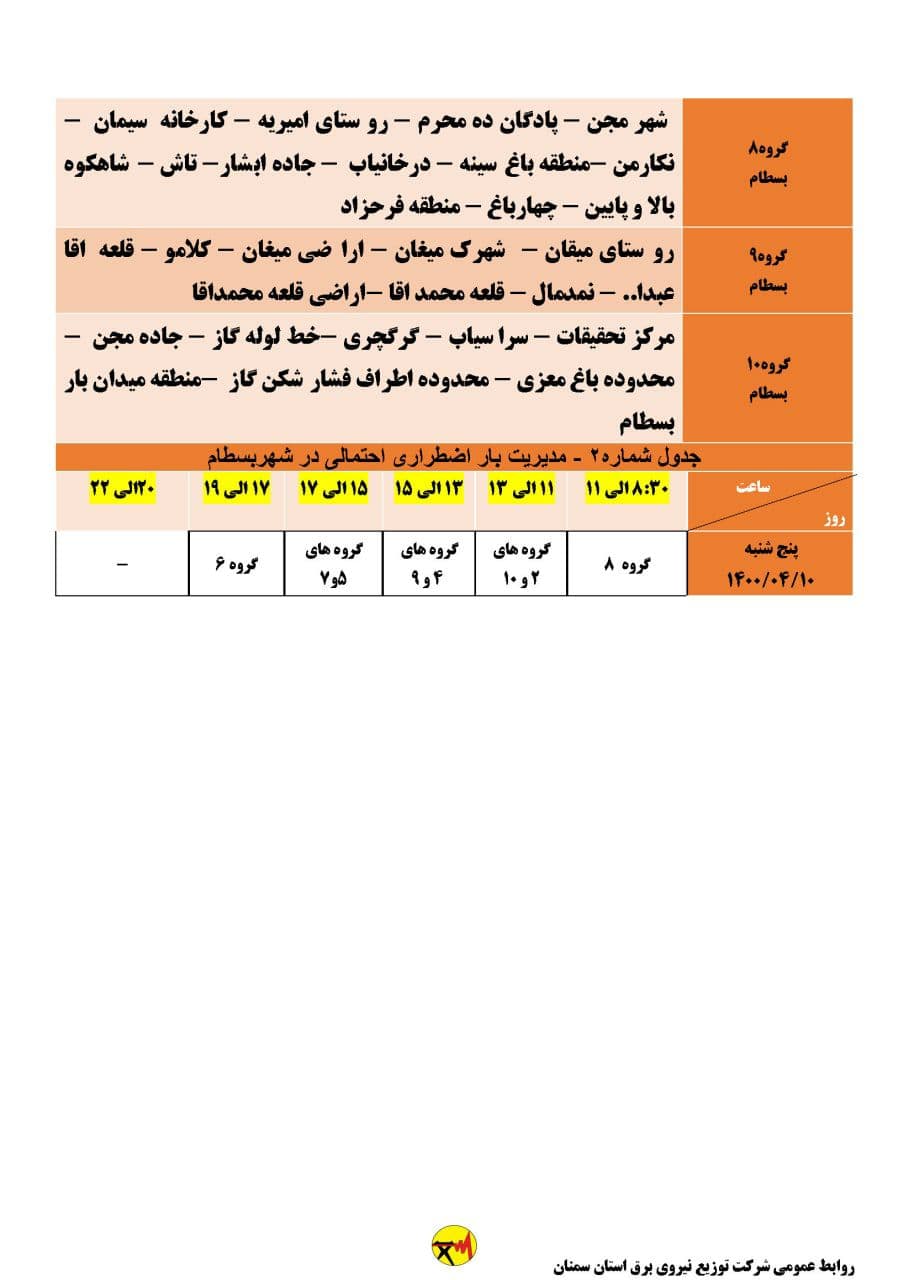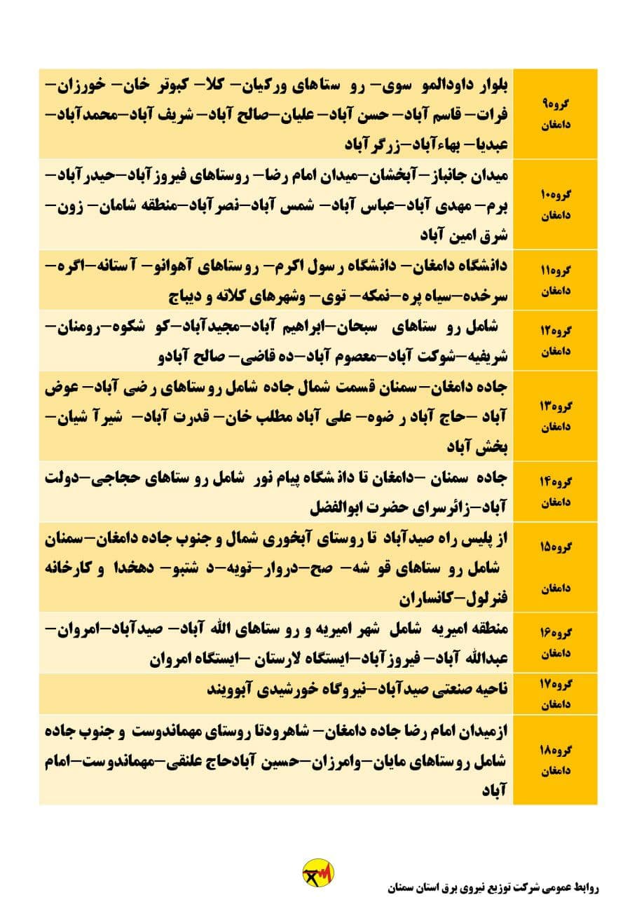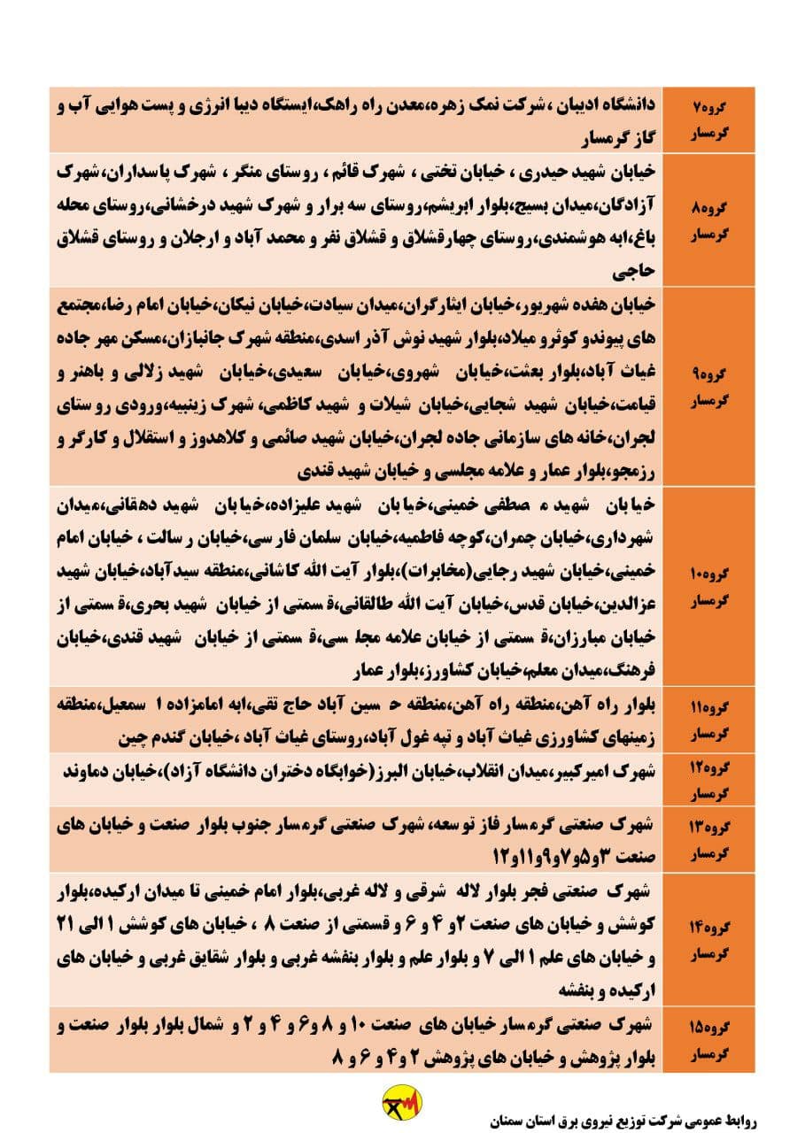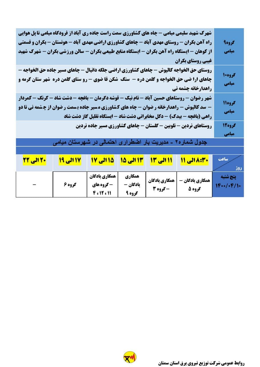 شرکت توزیع برق استان سمنان، برنامه مدیریت بار اضطراری برق و خاموشیهای احتمالی را در روز پنجشنبه دهم تیرماه ماه اعلام کرد.
