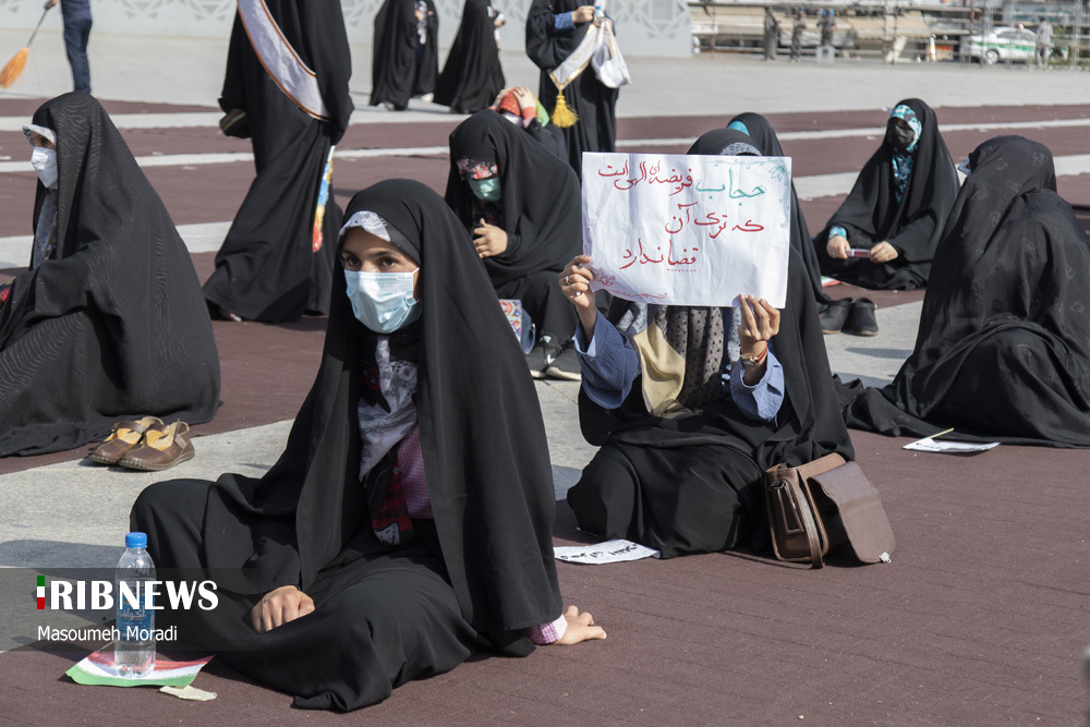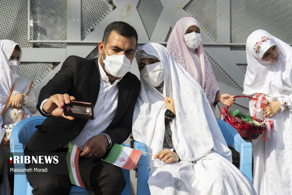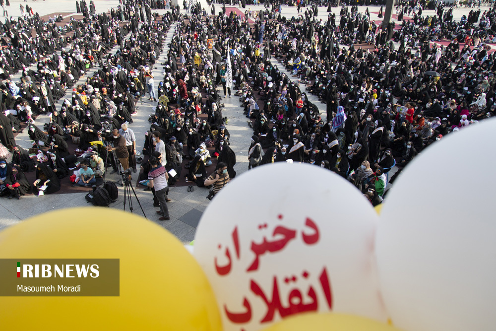 به گزارش گروه عکس خبرگزاری صدا وسیما؛ هدف از برگزاری این اجتماع شکست محاصره تبلیغاتی دشمن در ترویج بدحجابی و نیز حجاب اختیاری، نشان دادن مطالبه مردمی حجاب، ایجاد انگیزه در بانوان تازه محجبه و آمرین به معروف با تقدیر از آنها، به رخ کشیدن تمایل بانوان جامعه به حجاب و مطالبه مردمی از مسؤولان و متولیان حوزه حجاب و عفاف است. به همین مناسبت ۱۸ زوج جهادگر از ۱۵ سال تا ۳۰ سال مراسم ازدواجشان را به صورت نمادین جشن گرفتند. این زوج ها در قالب جهادگر، طلبه، خانواده های شهدا، ایثارگر و خادمان ایام کرونا و زلزله و سیل در بیمارستان ها و غسالخانه ها بودند.
