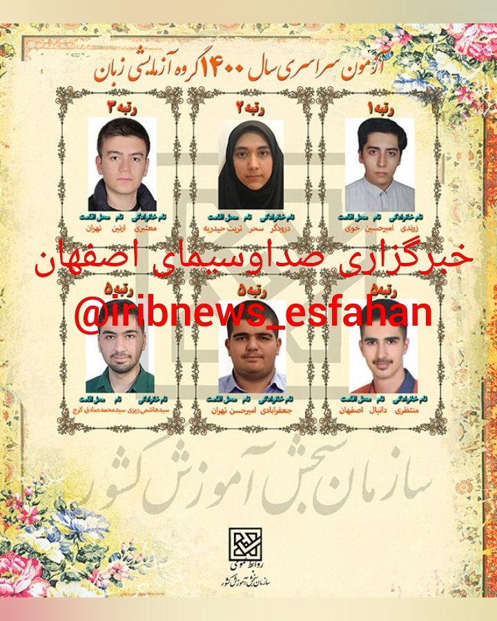 به گزارش خبرگزاری صدا و سیما، مرکز اصفهان؛ با اعلام نفرات برتر آزمون سراسری سال ۱۴۰۰، محمد جواد مهدیان رتبه سوم گروه آزمایشی علوم انسانی از شاهین شهر و میمه و محمد جواد احمدپور رتبه هفتم گروه آزمایشی علوم ریاضی و فنی، آوا فاضلی رتبه نهم گروه آزمایشی علوم تجربی و دانیال منتظری رتبه پنجم را در گروه زبانهای خارجی از اصفهان کسب کردند.