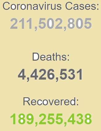 بر اساس آمار، تعداد مبتلایان به ویروس کرونا در جهان به بیش از ۲۱۱ میلیون نفر، شمار جان باختگان به بیش از ۴ میلیون و چهارصد هزار نفر و تعداد بهبودیافتگان به بیش از ۱۸۹ میلیون نفر افزایش یافت.
