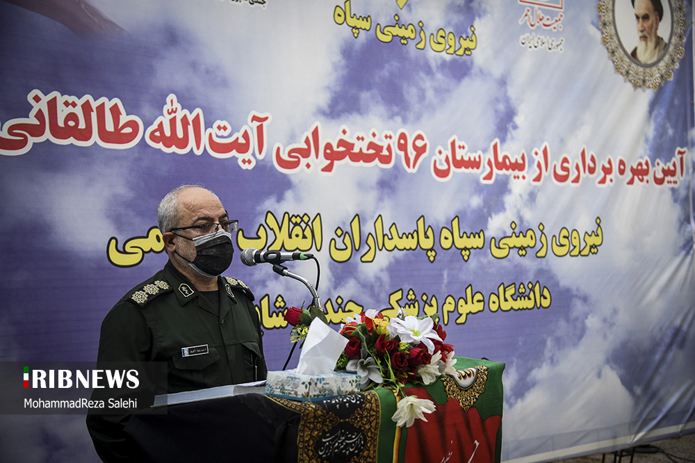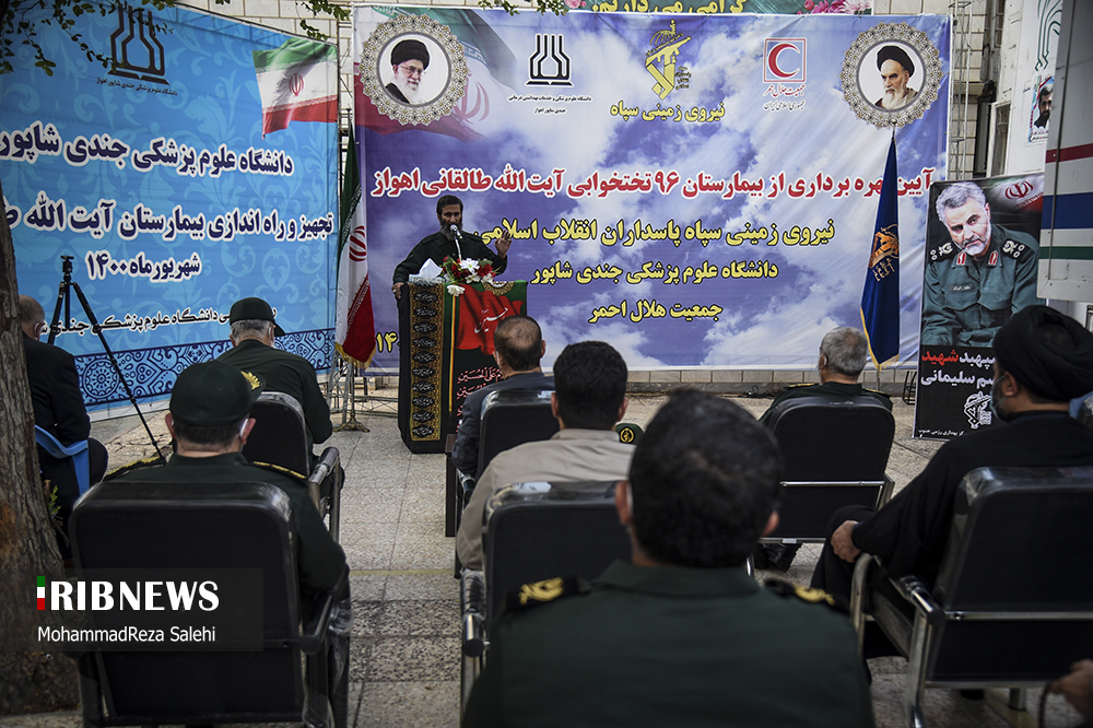 صبح امروز پنج شنبه ۱۱ شهریور با حضور سردار روح اله نوری جانشین فرمانده نیروی زمینی سپاه پاسداران، قاسم سلیمانی دشتکی استاندار خوزستان و جمعی از مسئولین استانی و پرسنل جمعیت هلال احمر بیمارستان۹۶ تخت خوابی آیت الله طالقانی توسط نیروی زمینی سپاه پاسداران به بهره برداری رسید.