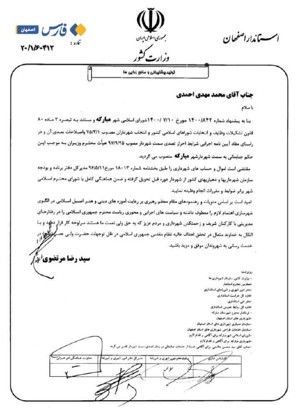 با حکم استاندار اصفهان محمد مهدی احمدی برصندلی شهرداری مبارکه تکیه زد.