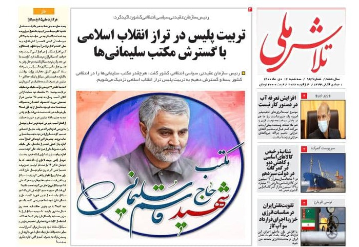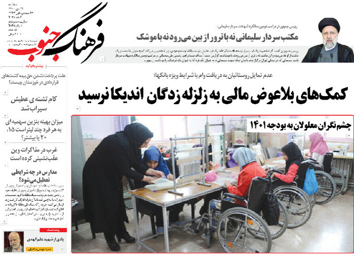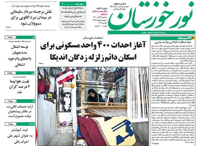 به گزارش خبرگزاری صدا و سیما مرکز خوزستان، رئیس جمهور در دومین سالگرد شهادت سردار سلیمانی : مکتب سردار سلیمانی نه با ترور از بین می رود نه با موشک - آغاز احداث ۴۰۰ واحد مسکونی برای اسکان دائم زلزله زدگان اندیکا -سنت مهجور گفت و شنود -تربیت پلیس در تراز انقلاب اسلامی با گسترش مکتب سلیمانی ها -شبکه گذاری فاضلاب در ۵۰۰ خیابان اهواز -سامانه جستجوی شغل و نیروی کار در خوزستان فعال شد از جمله عناوین مطبوعات امروز استان می باشد .