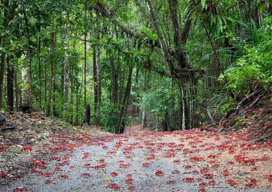 میلیون‌ها بچه خرچنگ قرمز در طول مهاجرت سالانه، مانند برگ‌های پاییزی، کف جنگل جزیره کریسمس را پر می‌کنند. هر چه از نزدیکتر نگاه کنید تعداد بیشتری را می‌بینید.