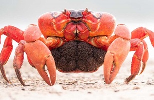 صبح زود تخم‌ریزی، خرچنگ‌های ماده بالغ در ساحل دور هم جمع می‌شوند و منتظر لحظه‌ دقیقی هستند که جزر و مد می‌گذرد و تخم‌هایشان را در دریا رها می‌کنند و اقیانوس را سیاه می‌کنند. هر خرچنگ قرمز ماده می‌تواند تا ۱۰۰ هزار تخم را حمل کند.