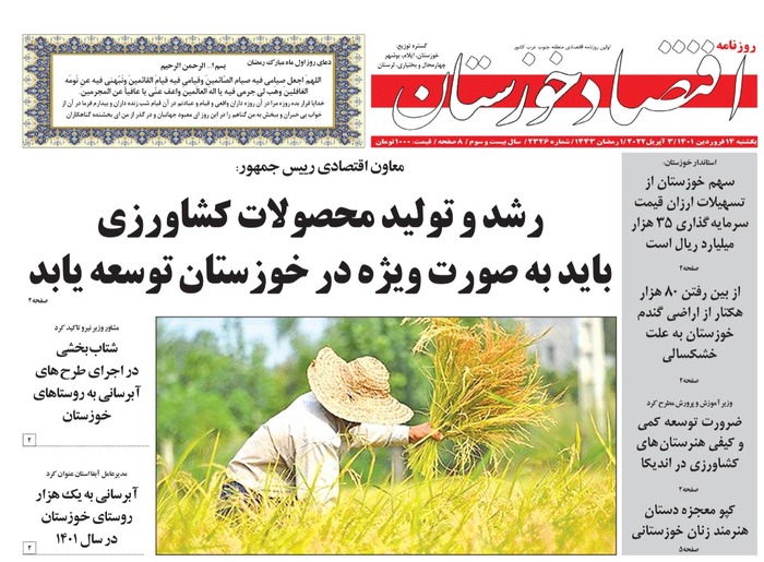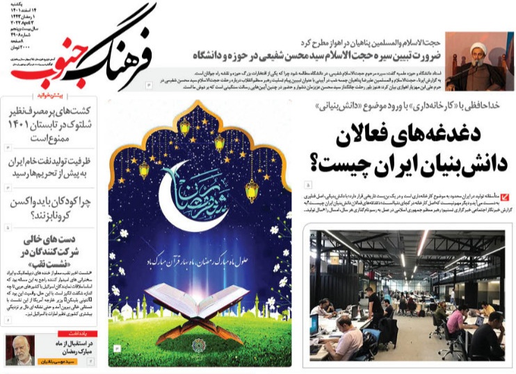 فرا رسیدن ماه مبارک رمضان ، توسعه محصولات کشاورزی در استان و بررسی مشکلات شرکت های دانش بنیان از جمله موضوعات مورد بررسی امروز مطبوعات خوزستان است.