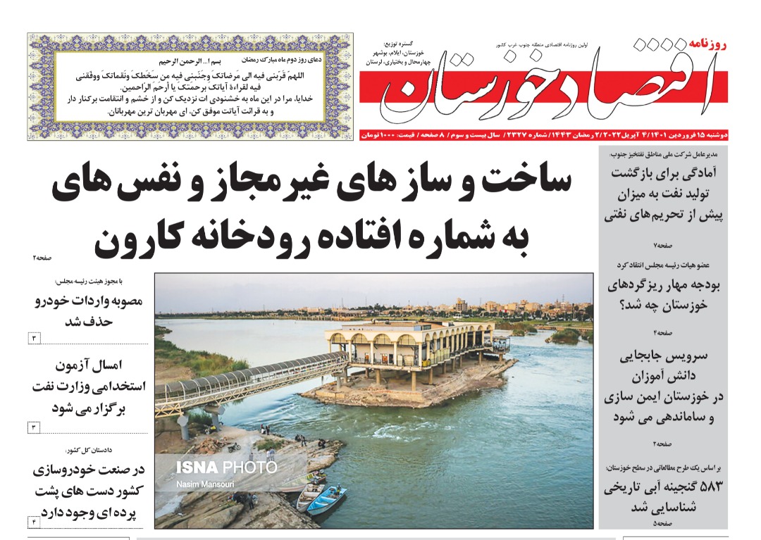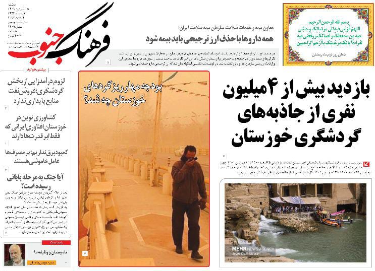 به گزارش خبرگزاری صدا و سیما مرکز خوزستان ، ۲ هزار و ۶۰۰ دستگاه کمباین برای برداشت کلزا و گندم خوزستان بسیج شدند-بودجه مهار ریزگردهای خوزستان چه شد؟ -بازدید بیش از ۴ میلیون نفری از جاذبه های گردشگری خوزستان -تردد بیش از ۱۵ میلیون خودرو در شبکه درون جادهای خوزستان -حمله ریزگردها به ریههای خوزستان-کیفیت پایین خودروهای داخلی عامل موثر در تلفات جادهای است - ساخت و سازهای غیر مجاز و نفسهای به شماره افتاده رودخانه کارون از جمله عناوین مطبوعات امروز خوزستان است.