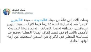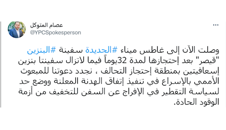 عصام المتوکل سخنگوی شرکت نفت یمن روز گذشته در توئیتی نوشت: کشتی حامل بنزین «قیصر» پس از ۳۲ روز توقیف وارد بندر الحدیده شد.