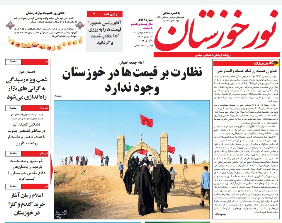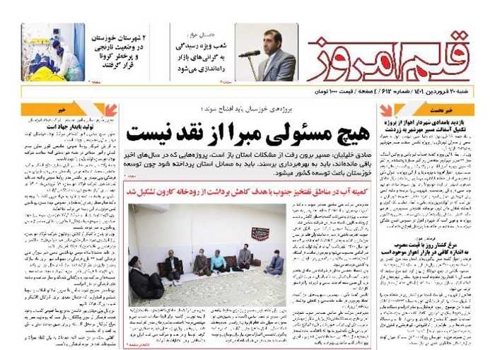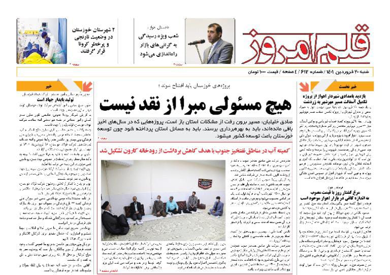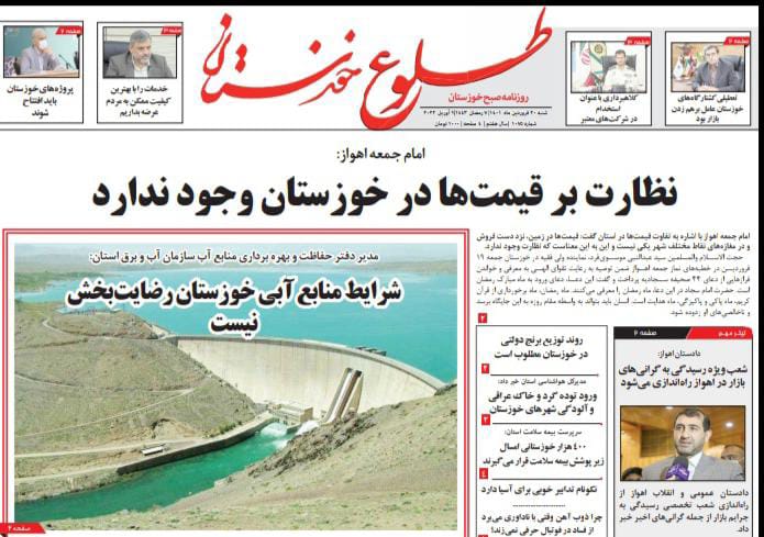 به گزارش خبرگزاری صدا و سیما مرکز خوزستان ، سهم پرداختی بیمار از هزینه های درمان کاهش می یابد-نظارت بر قیمت ها در خوزستان وجود ندارد - اصناف خوزستان باید از قیمت های مصوب تبعیت کنند -شعب ویژه رسیدگی به گران های بازار راه اندازی می شود.هیچ مسئولی مبرا از نقد نیست --شرایط منابع آبی خوزستان رضایتبخش نیست -توضیحی درباره انتشار خبر رهاسازی زباله های بیمارستانی در کنار منازل در اهواز از جمله عناوین مطبوعات امروز استان است .