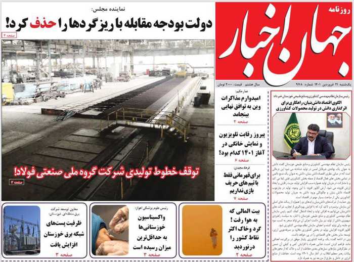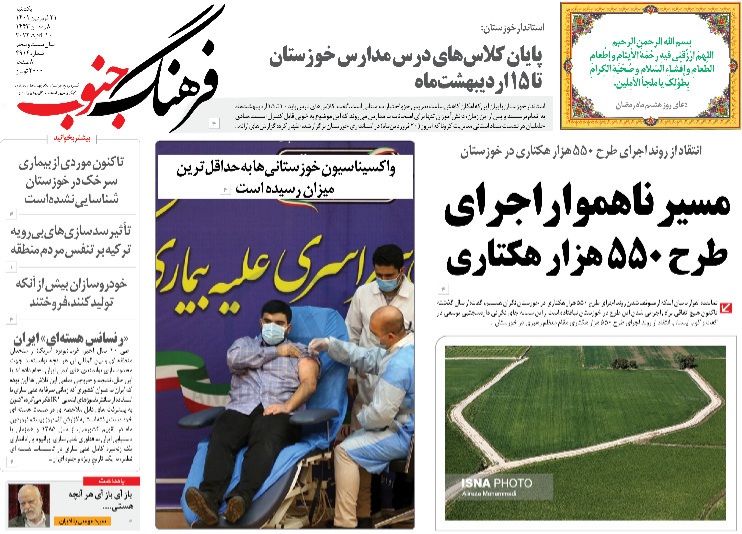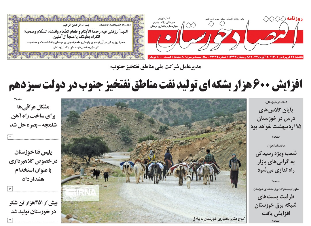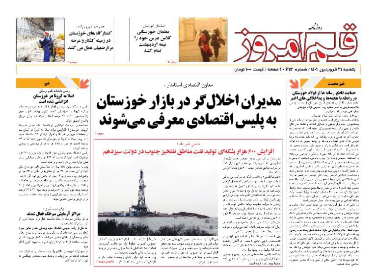 به گزارش خبرگزاری صدا و سیما مرکز خوزستان ، افزایش ۶۰۰ هزار بشکه‌ای تولید مناطق نفتخیز جنوب در دولت سیزدهم-مسیر ناهموار اجرای طرح ۵۵۰ هزار هکتاری-مدیران اخلال گر در بازار خوزستان به پلیس اقتصادی معرفی می‌شوند- -پایان کلاس‌های درس مدارس خوزستان تا ۱۵ اردیبهشت ماه- شیب ابتلا به کرونا در خوزستان در حال افزایش است--نکونام: می‌توانیم هر حریفی را با هر قدرتی تحت فشار قرار دهیم می‌خواهیم قهرمان جام حذفی بشویم- توقف خطوط تولیدی شرکت گروه ملی صنعتی فولاد ! از جمله عناوین امروز مطبوعات استان است.