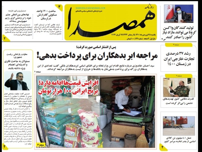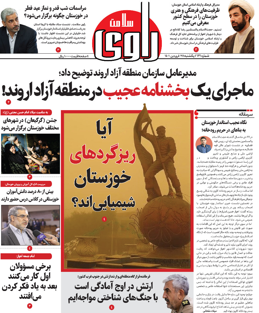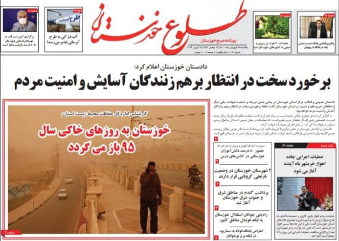 به گزارش خبرگزاری صدا و سیما مرکز خوزستان ، ارتش امن‌ترین آسمان را برای کشور ایجاد کرده است -تولید کنندگان واکسن کرونا می‌توانند مازاد نیاز کشور را صادر کنند-برداشت گندم در مناطق شرق و جنوب شرق خوزستان آغاز شد -برگزاری آیین شب قدر در شهر‌های نارنجی خوزستان با ۵۰ درصد ظرفیت مجاز است ظرفیت‌های فرهنگی و هنری خوزستان را در سطح کشور معرفی می‌کنیم -آیا ریزگرد‌های خوزستان شیمیایی اند؟ -برخورد سخت در انتظار برهم زنندگان آسایش و امنیت مردم -شرایط برای کاهش قیمت گوشت قرمز گوسفندی در اهواز مهیاست -نه دره سیلیکون نه جاده ۱۲۸ نسخه بومی -از جمله عناوین مطبوعات امروز خوزستان است.