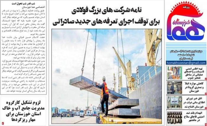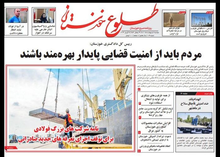 به گزارش خبرگزاری صدا و سیما مرکز خوزستان ، صادرات محصولات کشاورزی خوزستان به کشور عراق افزایش یافت-لزوم نشکیل کارگروه مدیریت جامع آب و خاک استان خوزستان مدیریت منابع آبی و رفع مشکلات آن نیاز به خرد جمعی و تعقل دارد -برای مهار ریزگردها-برنامه ریزی برای خروج ۹۸ واحد صنعتی راکد در خوزستان -استفاده از همه ظرفیت‌های نیشکری برای تولید و اشتغال -انهدام باند ضد امنیتی قاچاق سلاح در ماهشهر -کاهش جمعیت کیفری نباید خللی به امنیت خوزستان وارد کند و بیش از یک سال اختلال در جمع اوری پسماند‌های اهواز از جمله عناوین مطبوعات امروز خوزستان است.