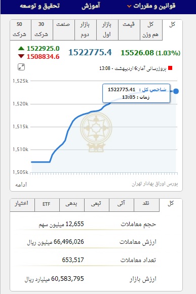 شاخص کل بورس اوراق بهادار تهران در پایان معاملات با ۱۵ هزار و ۵۲۶ واحد افزایش بر روی عدد یک میلیون و ۵۲۲ هزار واحدی قرار گرفت که در مقایسه با دیروز یک درصد بازدهی مثبت داشت.