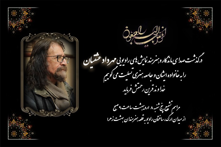 زمان مراسم تشییع و وداع با پیکر زنده یاد مهرداد عشقیان، نویسنده، بازیگر، گوینده و کارگردان نمایشهای رادیویی اعلام شد.