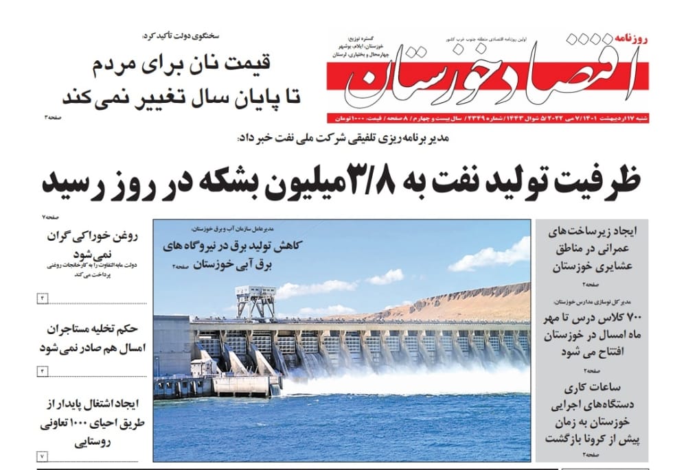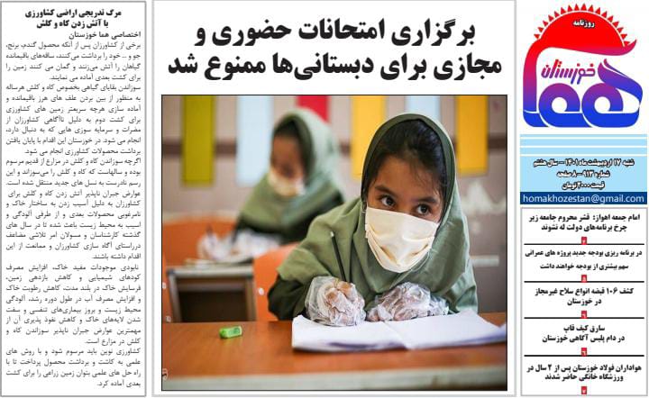 به گزارش خبرگزاری صدا و سیما مرکز خوزستان ، دولتمردان وضعیت اقتصادی کشور را برای مردم تشریح کنند-ظرفیت تولید نفت به ۳/۸ میلیون بشکه در روز رسید -برگزاری امتحانات حضوری و مجازی برای دبستانیها ممنوع شد -۶۶ درصد مطالبات کشاورزان خوزستانی پرداخت شد از جمله عناوین امروز مطبوعات خوزستان است.