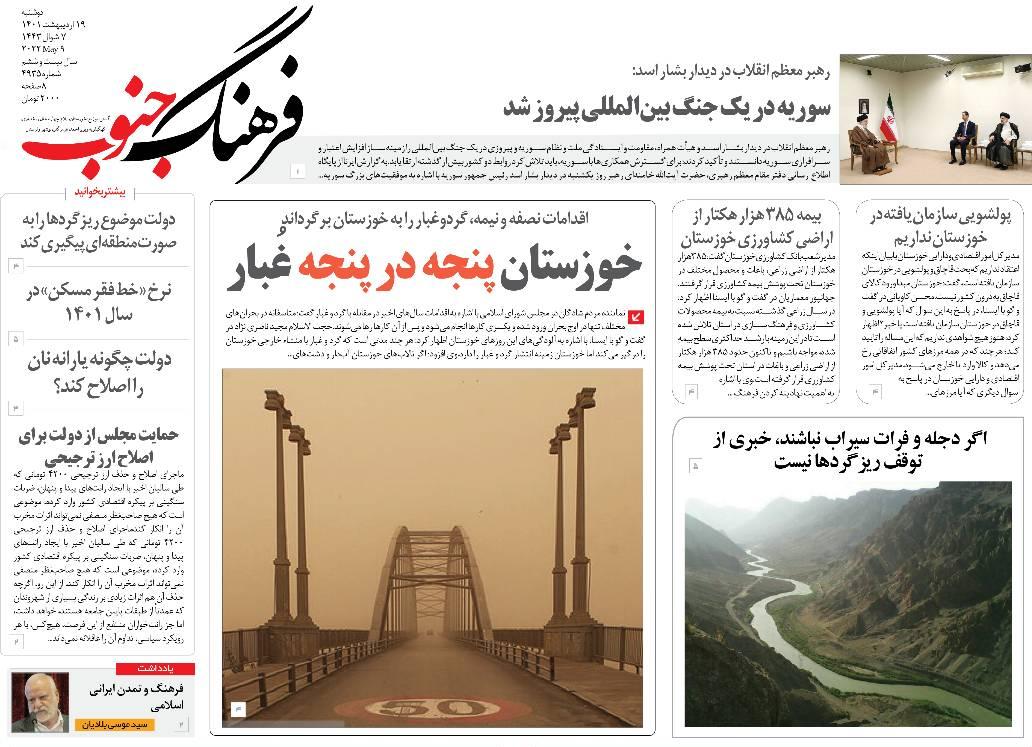 دیدار رئیس جمهور سوریه با رهبر معظم انقلاب ، وضعیت سدهای خوزستان و وضعیت توزیع کالاهای اساسی در بازار از جمله موضوعات مورد بررسی امروز مطبوعات خوزستان است .