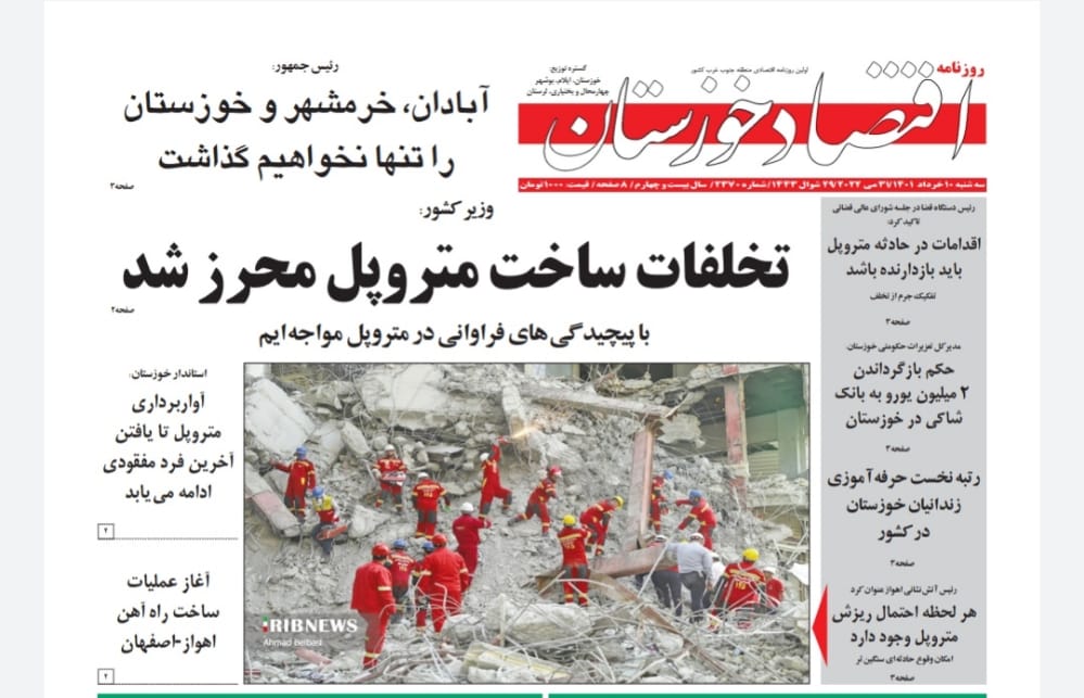 به گزارش خبرگزاری صدا و سیما مرکز خوزستان ، رهبر معظم انقلاب : توجه به ظرفیتهای درونی اسلحه تحریم را از کار میاندازد - ساختمان های ناایمن فوری شناسایی و مقاوم سازی شوند - چگونه بر آلام مردم داغدار آبادان مرهم بگذارید؟ ! - آغاز عملیات ساخت راه آهن اهواز-اصفهان- شرایط متروپل از پلاسکو پیجیدهتر است - آبادان و خرمشهر را تنها نخواهیم گذاشت- یک مرکز توزیع دارو در اهواز راه اندازی شد - کشف یک زمین جدید با قابلیت سکونت ! - احتمال وقوع فاجعه بزرگتر از متروپل وجود دارد - از مهاجرت پذیرترین تا مهاجر فرست ترین و بحران اطلاع رسانی در بحران ! ، از جمله عناوین امروز مطبوعات خوزستان است .