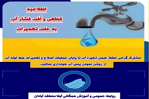 آبفا منطقه آبادان ضمن پوزش از ساکنان محترم منطقه از آنان خواست در زمان تعمیر خط لوله آب، پمپ های آب منازل خود را خاموش نگهدارند و نسبت به ذخیره آب از هم اکنون اقدام کنند.