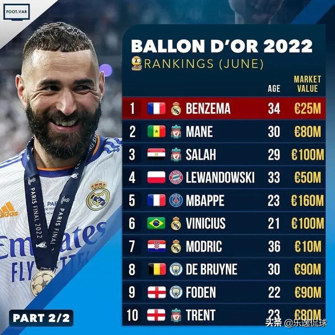 به گزارش گروه ورزشی خبرگزاری صداوسیما، کریم بنزما ستاره فرانسوی تیم فوتبال رئال مادرید در صدر فهرست رده بندی احتمالی توپ طلای سال ۲۰۲۲ قرار دارد.
