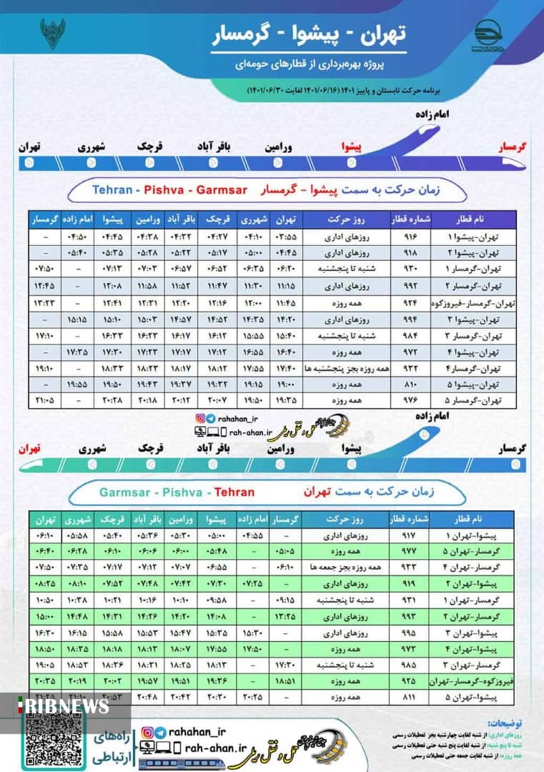 قطارهای روزهای اداری برای فردا همگی خدمات می دهند و همچنین دو رام قطار فوق العاده هم ساعت ۱۴ و ۱۵:۲۰ از ری بسمت پیشوا برای زائرینی که صبح با قطارهای روزانه عازم حرم حضرت عبدالعظیم حسنی شده اند برای برگشت هماهنگ شده است.