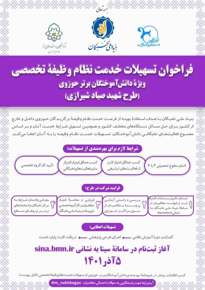 ثبت نام تسهیلات خدمت نظام وظیفه تخصصی ویژه دانش آموختگان برتر حوزوی (طرح شهید صیاد شیرازی ویژه طلاب) آغاز شد.