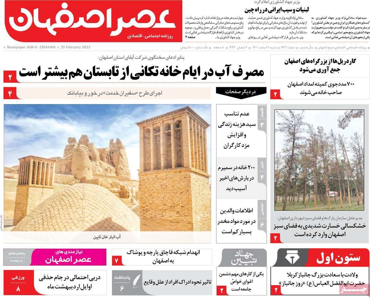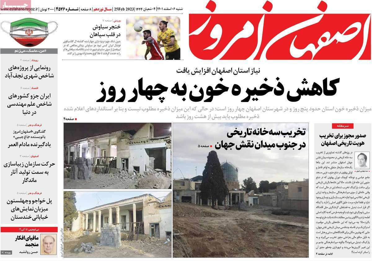عناوین روزنامههای شنبه ۶ اسفند ۱۴۰۱ اصفهان