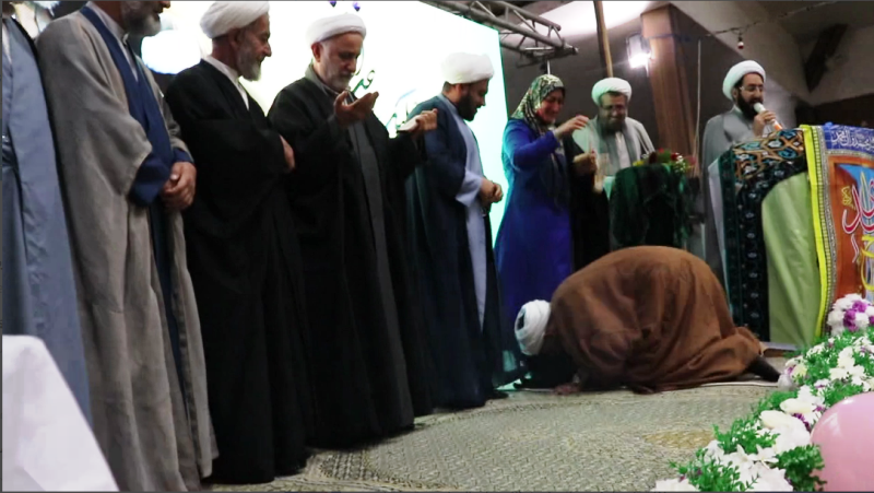 یادآور می شود در این آیین دو طلبه ای که توسط مادران خود معمم شدند به نشانه سپاس از مقام و منزلت مادر در تربیت فرزند بر پای مادران خود بوسه زدند.