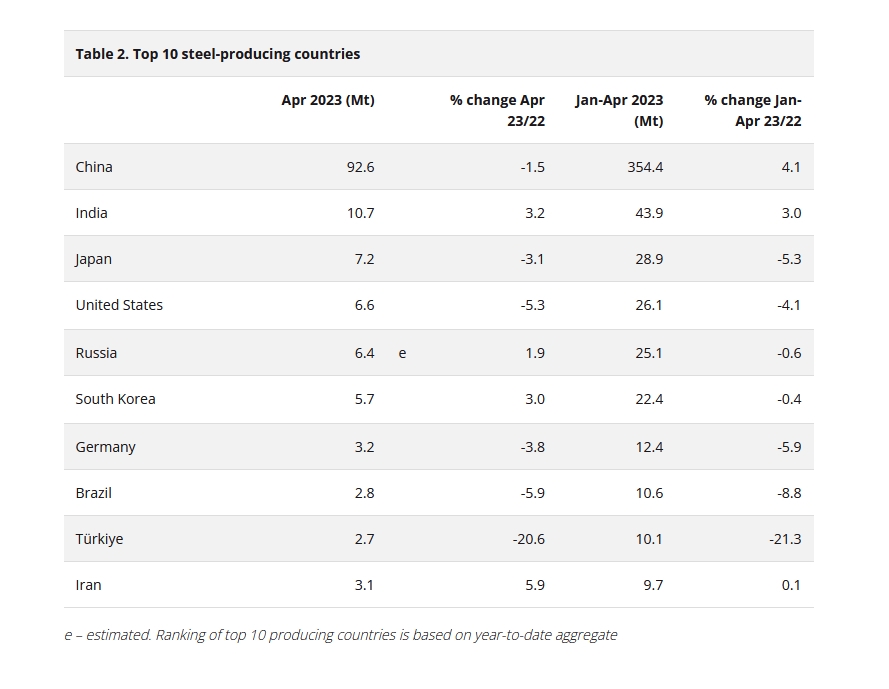 همچنین ۶۳ فولادساز بزرگ جهان طی آوریل ۲۰۲۳ میلادی ۱۶۱ میلیون و ۴۰۰ هزار تن فولاد خام تولید کردند که این میزان تولید افت ۲.۴ درصدی نسبت به مدت مشابه سال ۲۰۲۲ میلادی نشان میدهد.