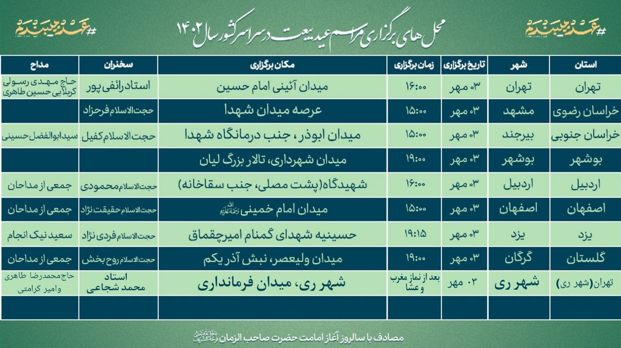 در تهران این مراسم در میدان آئینی امام حسین (ع) روز دوشنبه سوم مهر از ساعت ۱۶ برگزار خواهد شد. علاوه بر این، مراسم دیگری در مهدیه تهران با عنوان عید بزرگ بیعت از ساعت ۲۰ برگزار می‌شود.