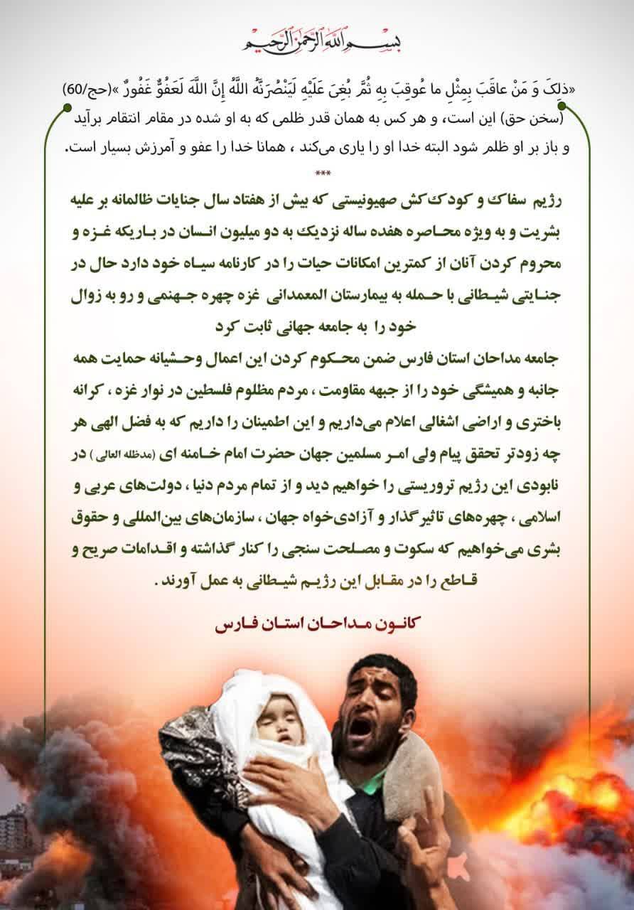 کانون مداحان فارس جنایات اسرائیل را در کشتار مسلمانان مظلوم غزه محکوم کرد .