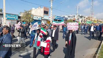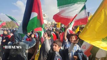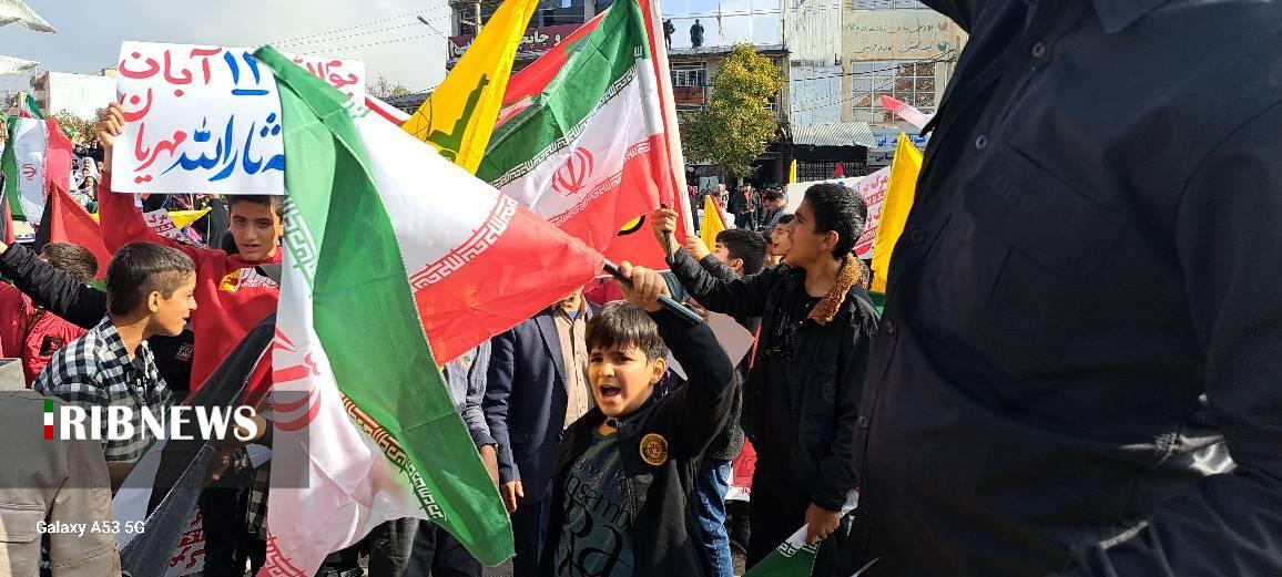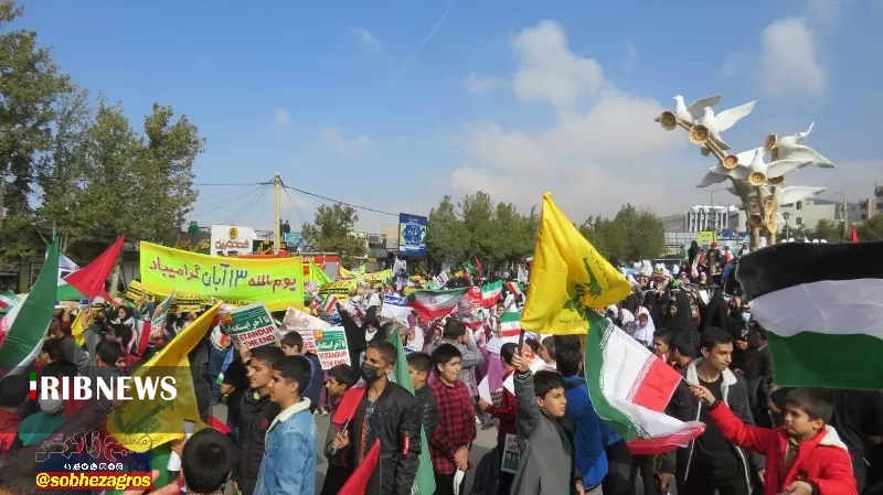 شرکت کنندگان در راهپیمایی یوم الله ۱۳ آبان همچنین با سر دادن شعار‌های الله اکبر و مرگ بر اسرائیل ضمن حمایت از مردم مظلوم غزه، خواستار پایان اقدامات ددمنشانه رژیم صهیونیستی شدند.
