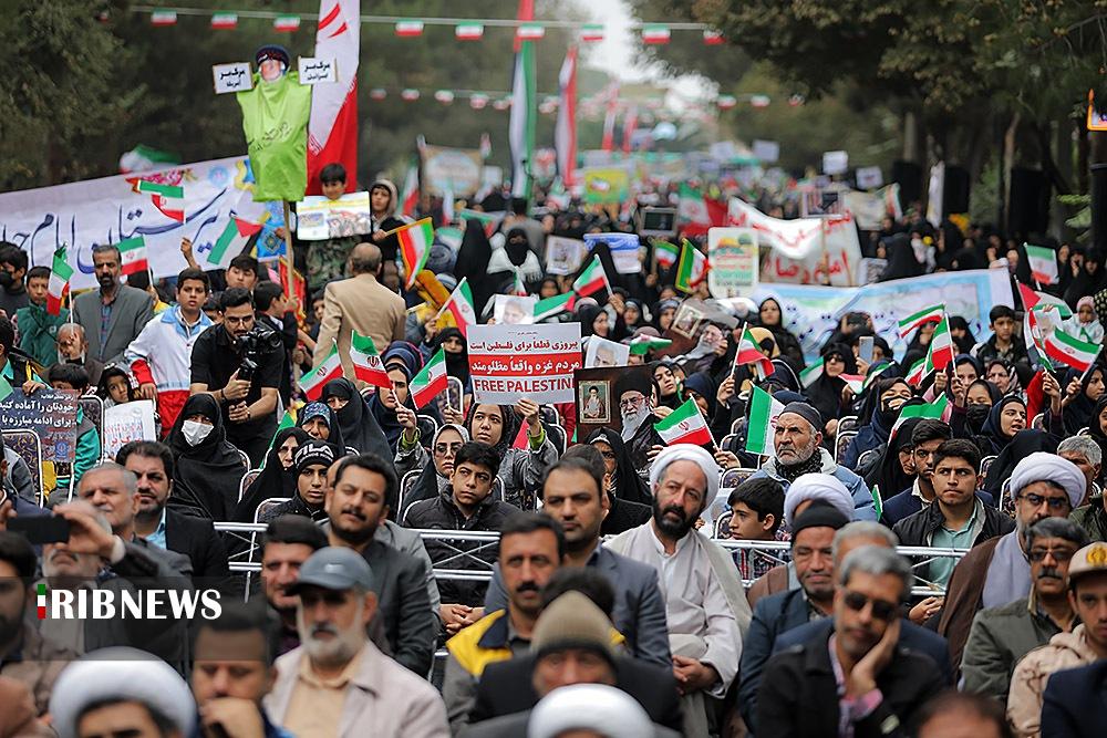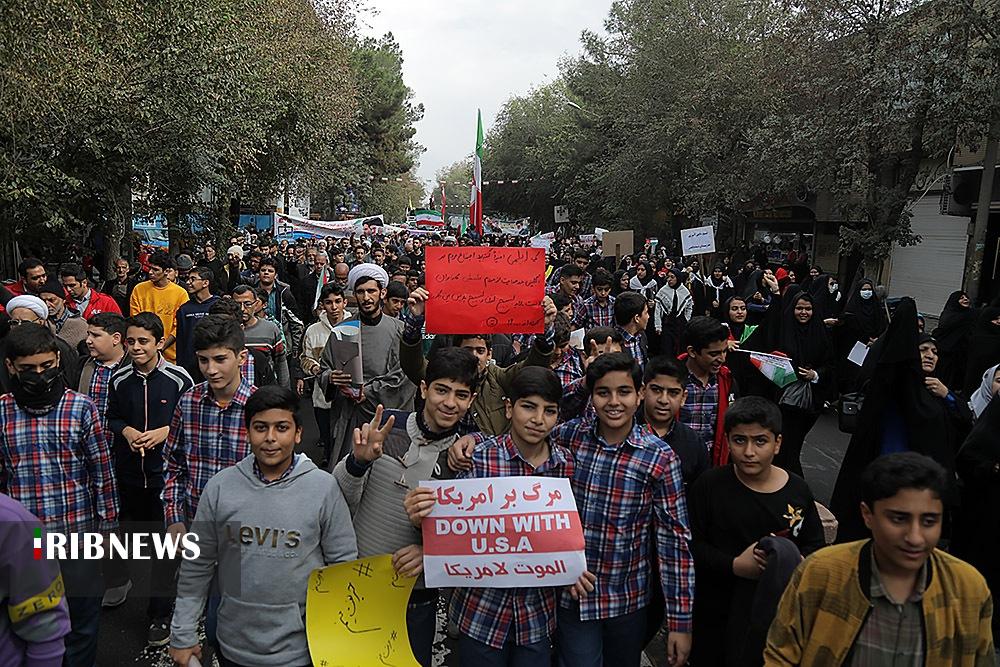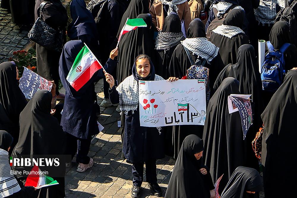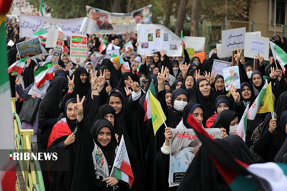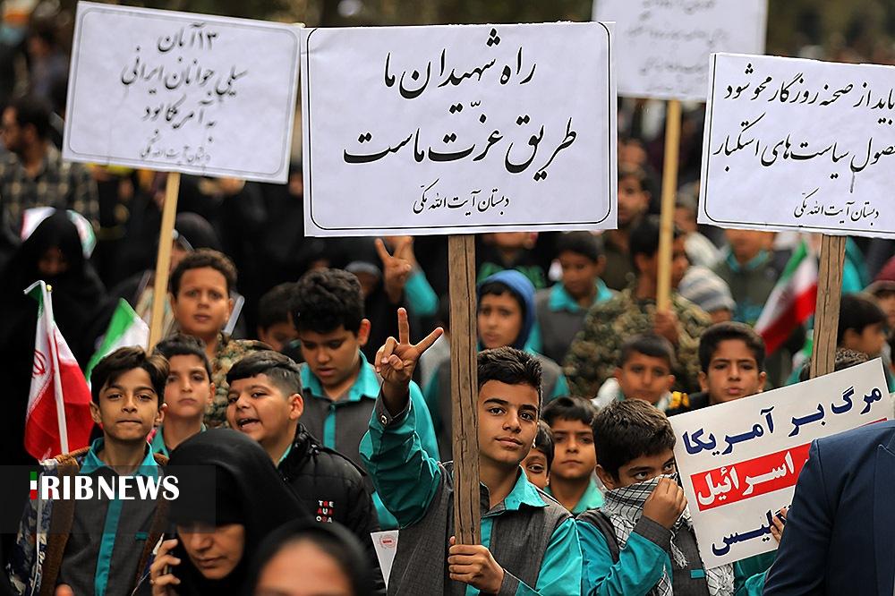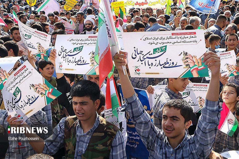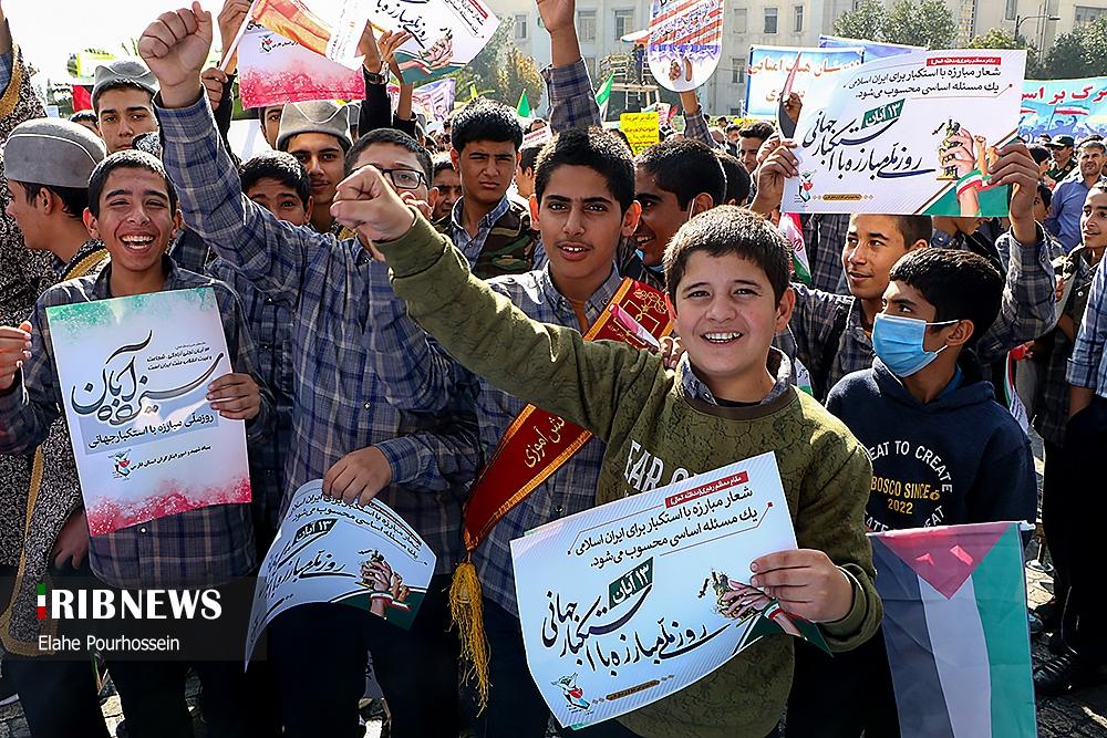 صبح امروز سیزدهم آبان ماه ۱۴۰۲، راهپیمایی روز ملی مبارزه با استکبار جهانی، و مراسم یومالله ۱۳ آبان، با حضور مردم و دانشآموزان و با شعار محوری «نظم نو جهانی با نسل آرمانی» در شیراز و جزیره کیش و کاشان و سایر استانهای کشور برگزار شد. حاضران در راهپیمایی امروز، ضمن محکومیت جنایتهای رژیم غاصب صهیونیستی، با همدستی آمریکای جنایتکار، حمایت خود را از آرمانهای انقلاب اسلامی و گروههای مقاومت فلسطینی اعلام و همراهی و همدردی خویش با ملت مقاوم و مظلوم غزه را، اعلام مینمایند.