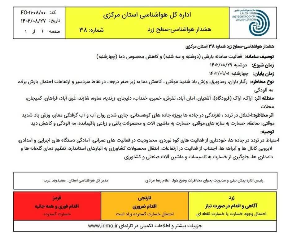 فعالیت سامانه بارشی جدید در استانبه گزارش خبرگزاری صداوسیمای مرکز اراک؛ بر اساس هشدار سطح زرد هواشناسی بررسی ها حاکی از فعالیت سامانه بارشی در روز دوشنبه و سه شنبه در استان می باشد.