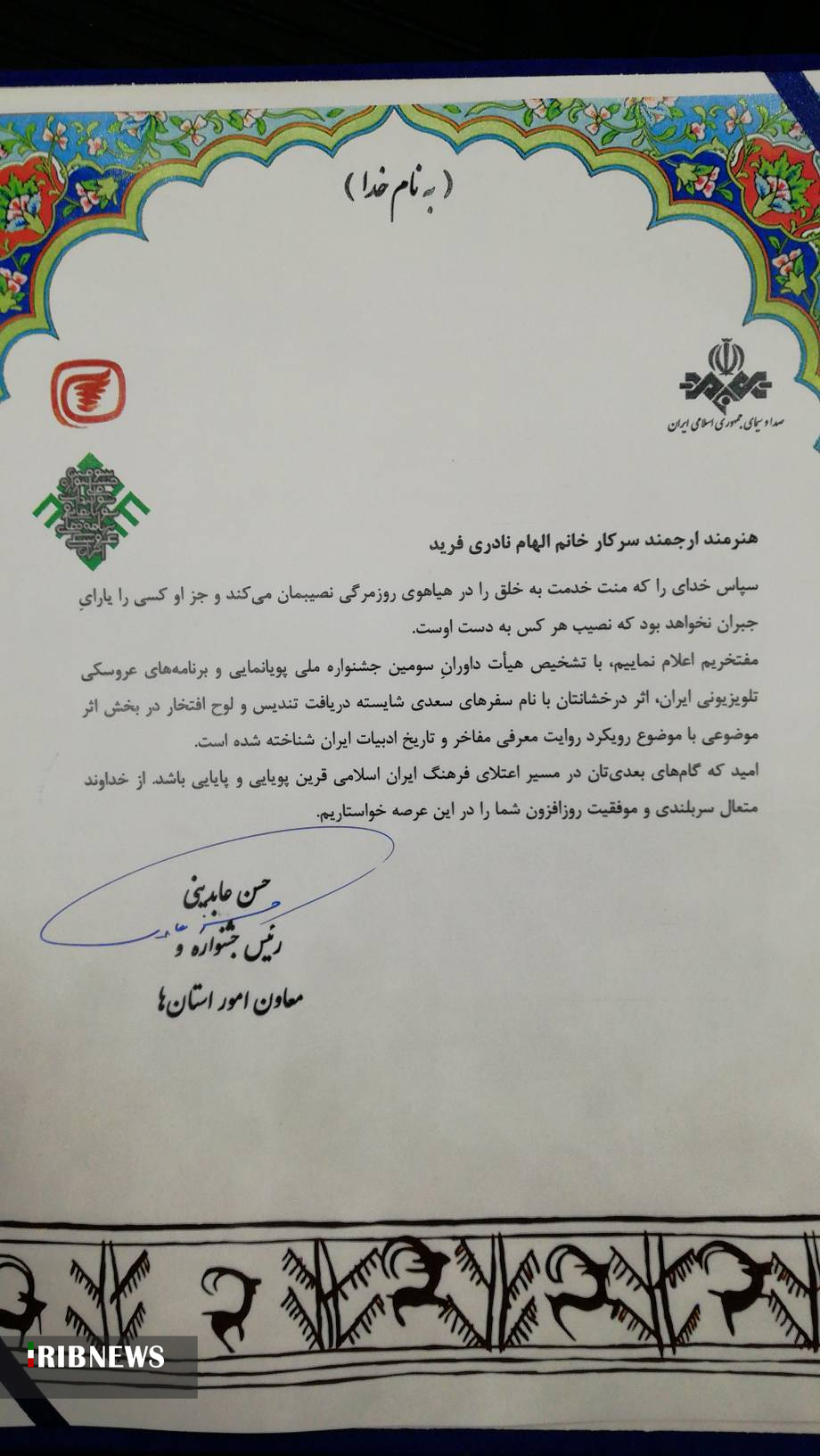 خانم الهام نادری فرید هم با انیمیشن سفرهای سعدی ، جایزه تندیس و لوح افتخار را در بخش اثر موضوعی با رویکرد روایت معرفی مفاخر و تاریخ ادبیات ایران از آن خود کرد.