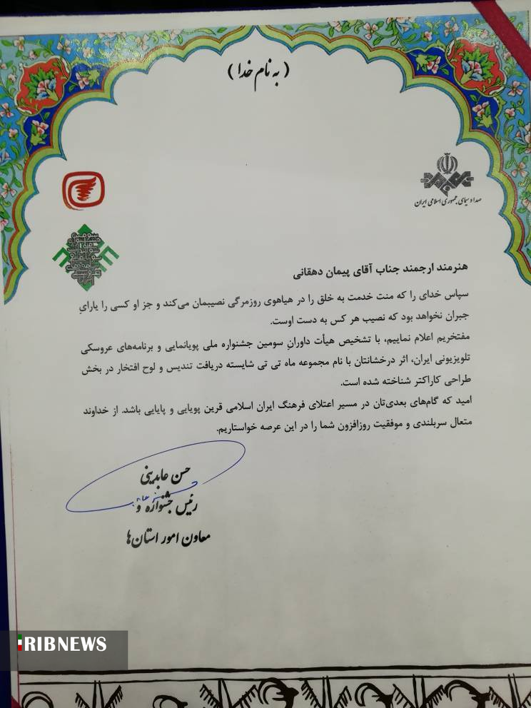 به گزارش خبرگزاری صدا و سیما، مرکز فارس، سومین جشنواره پویا نمایی و نمایش عروسکی کشور در صدا و سیمای مرکز زاهدان برگزار شد و در این جشنواره سه اثر شامل انیمیشنهای ماه تی تی، سفرهای سعدی و فیلم کوتاه والیبال صاحب ۳ تندیس و یک لوح افتخار افتخار شدند.