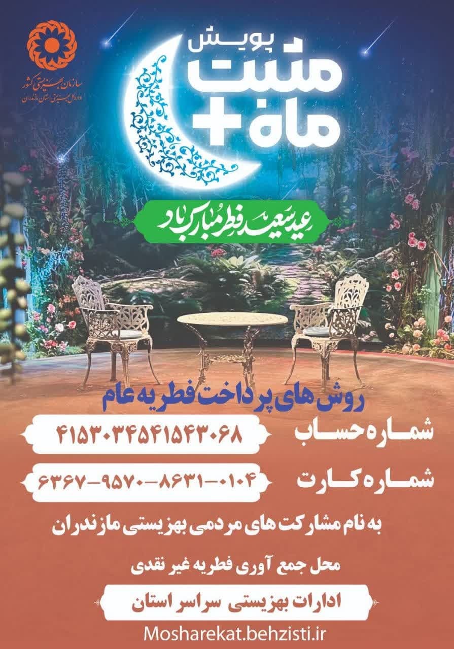 مدیرکل بهزیستی مازندران با اشاره به روشهای جذب مشارکتهای مردمی برای دریافت فطریه، افزود: علاوه بر استقرار صندوقهای جمع آوری کمکهای مردمی در همه شهرستانها، مراکز تحت نظارت بهزیستی مازندران برای دریافت کمکهای نقدی، شماره حساب:۴۱۵۳۰۳۴۵۴۱۵۴۳۰۶۸ و شماره کارت:۰۱۰۴-۸۶۳۱-۹۵۷۰-۶۳۶۷ بنام مشارکتهای مردمی بهزیستی مازندران و ادارات بهزیستی سراسر استان آماده دریافت زکات فطریه هم استانیهاست.