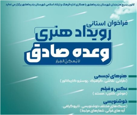 سازمان بسیج هنرمندان و اداره فرهنگ و ارشاد اسلامی بندر ماهشهر رویداد هنری وعده صادق را در سطح استان خوزستان برگزار میکنند.