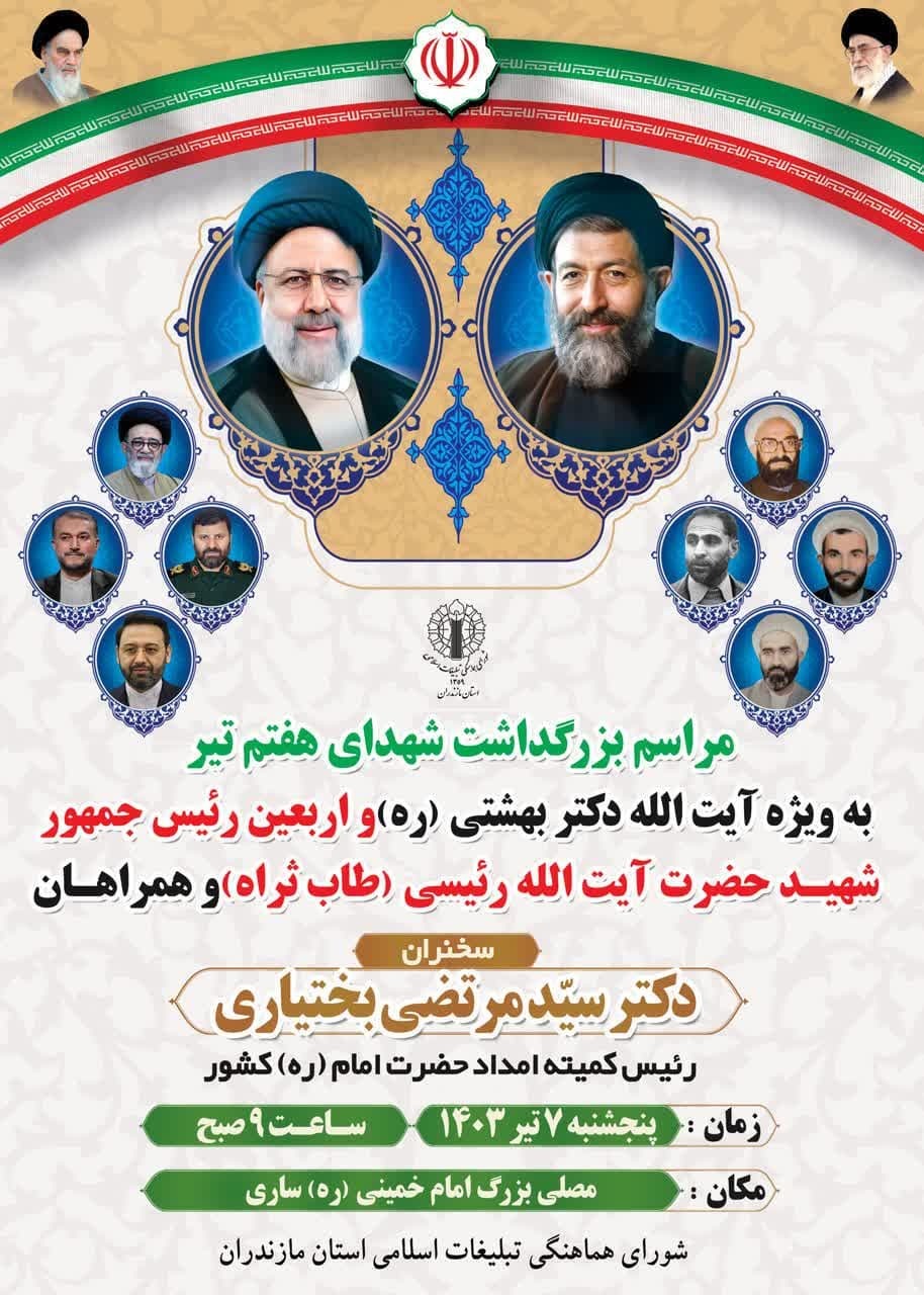 به گزارش خبرگزاری صدا و سیمای مازندران، شـورای هماهنگی تبلیغات اسلامی مازندران اعلام کرد آیین گرامیداشت شهدای والامقام هفتم تیر و ۴شهید استان مازندران و اربعین شهدای خدمت فردا پنجشنبه ۷ تیر ساعت ۹ صبح در مصلی بزرگ امام خمینی (ره) ساری برگزار است.